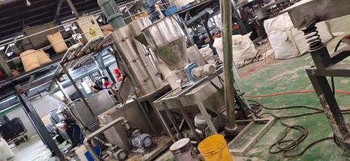 密煉機的團狀料經(jīng)提升機,雙腕喂料機,擠出機,切粒,冷卻,篩分,終端料倉全部自動化,流水作業(yè)。物料密煉后經(jīng)過雙腕